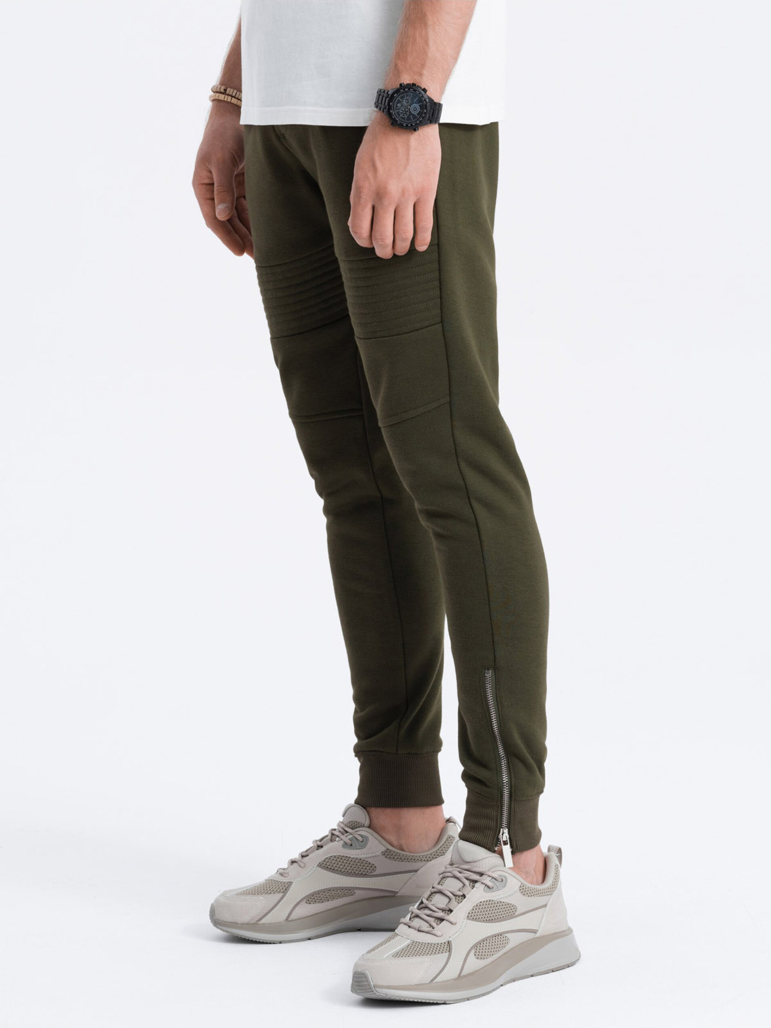 Pantaloni de trening pentru bărbați cu manșete cu nervuri și fermoar decorativ - Sand Ombre Clothing