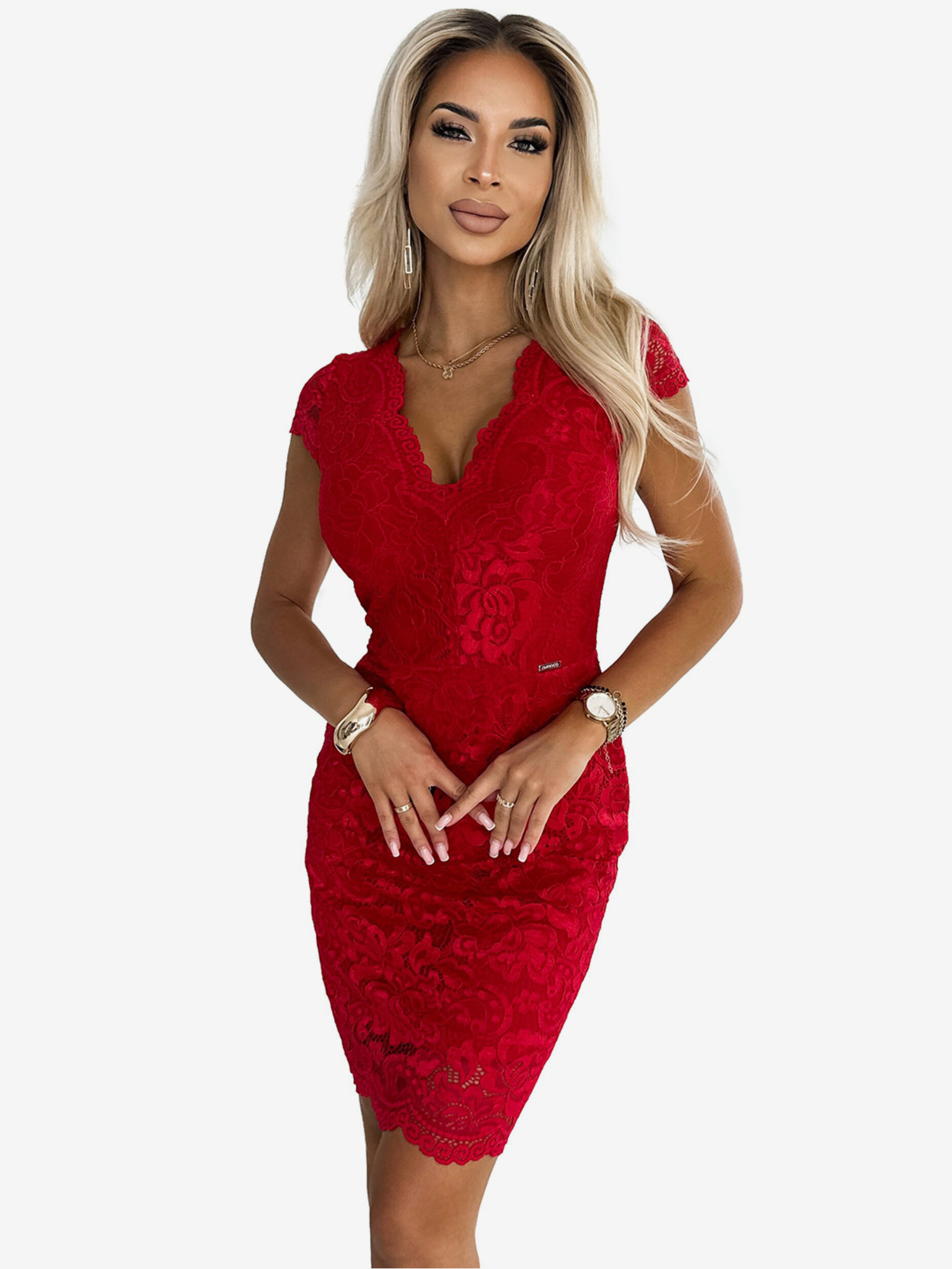 Rochie din dantelă cu mânecă scurtă și decolteu în inimă - roșu Numoco