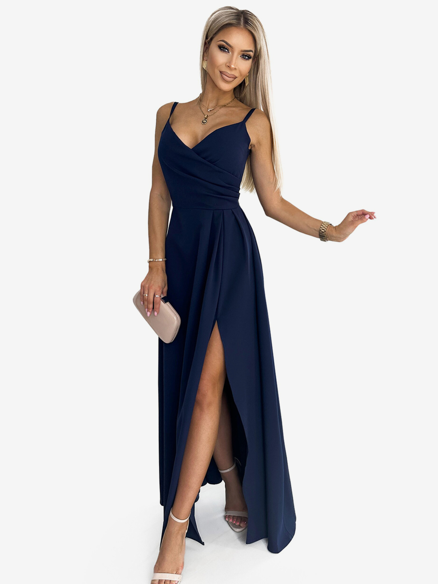 Rochie lungă cu decolteu și sclipici - albastru închis Numoco CRYSTAL