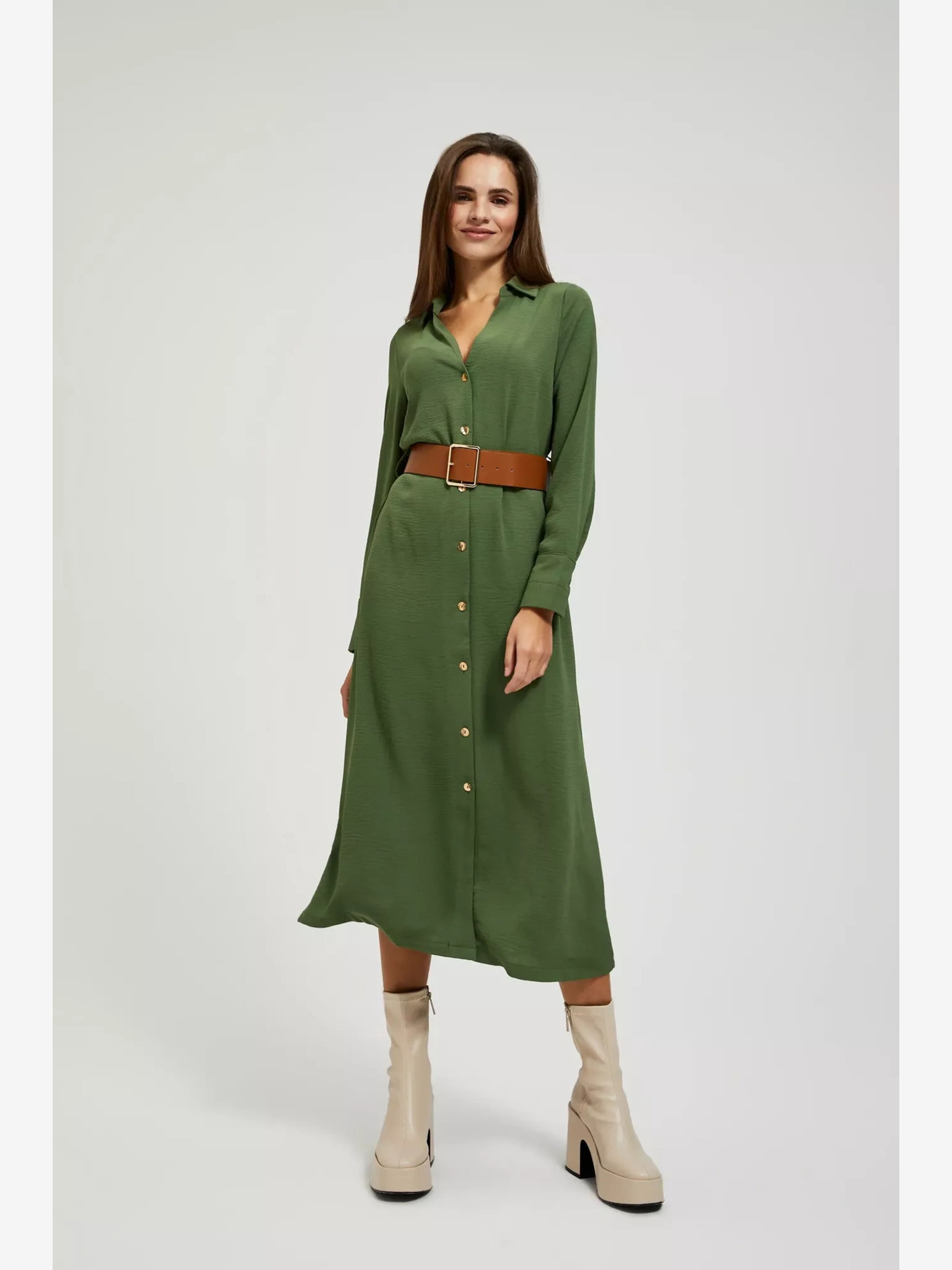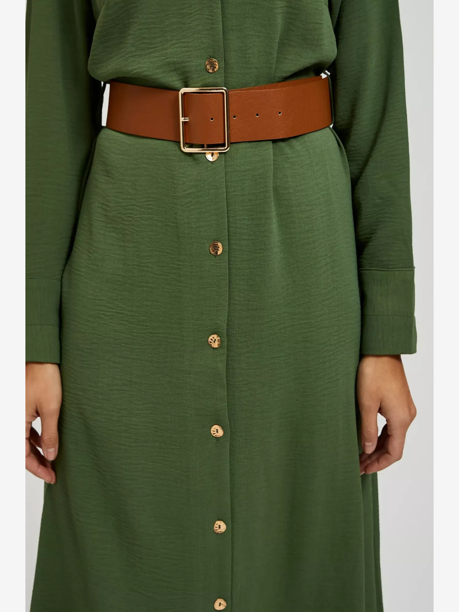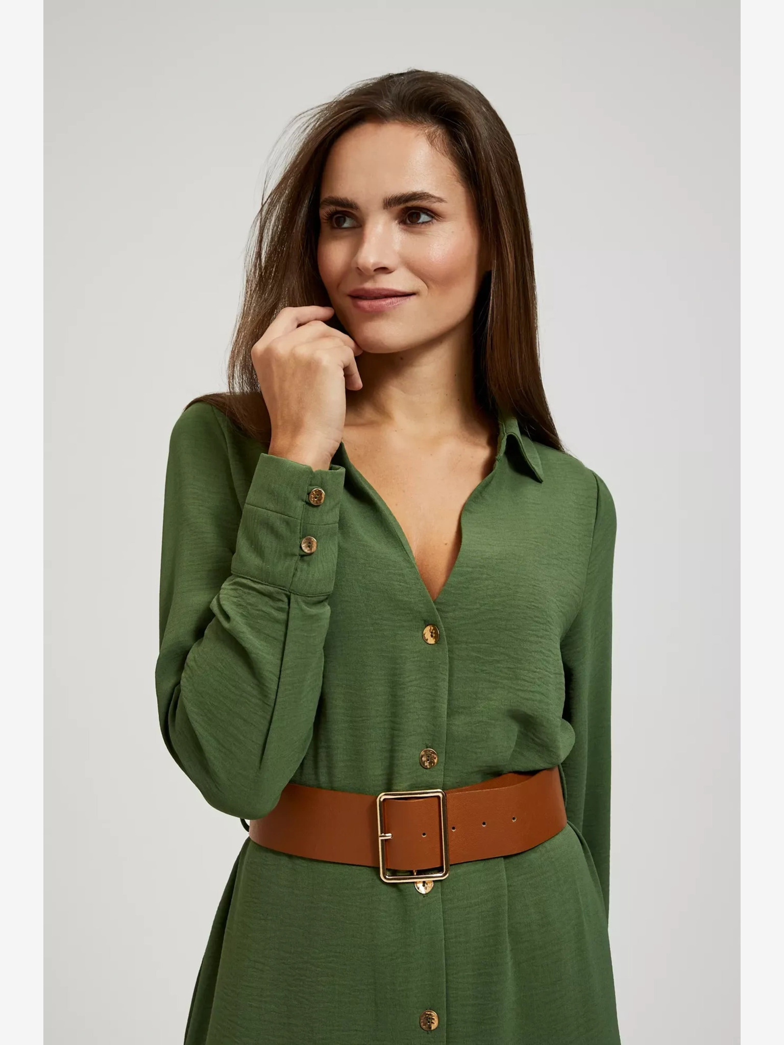 Rochie tip cămașă CAMILLE de culoare măslie cu buzunare și șnuruit