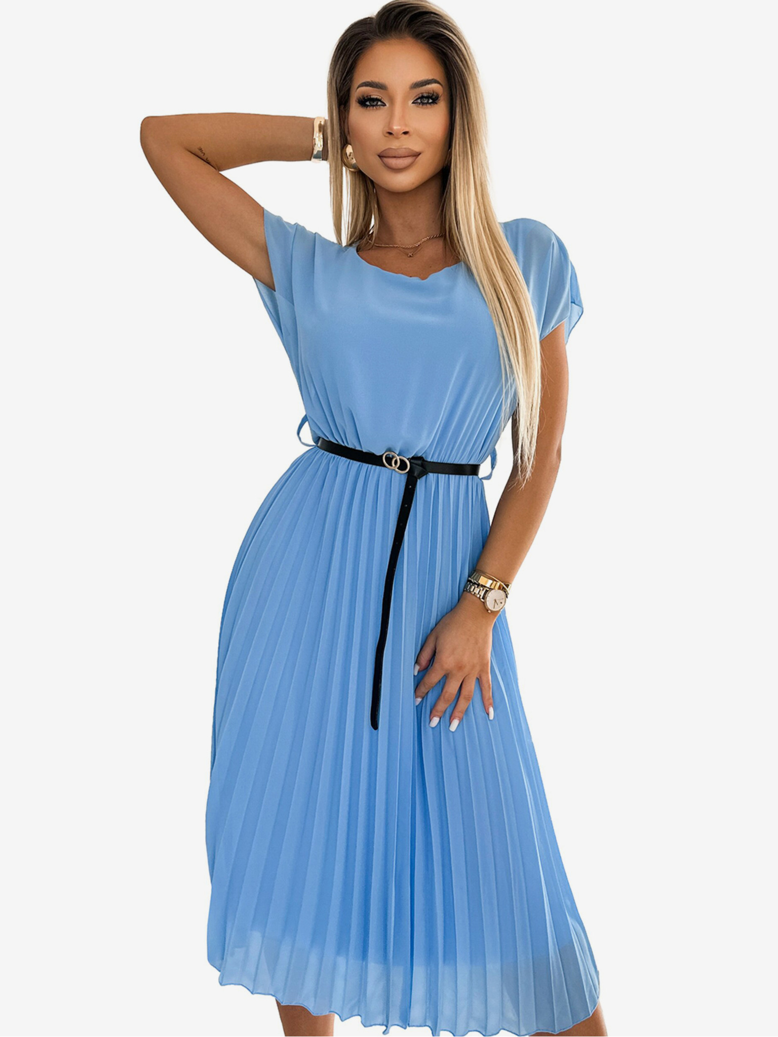 Rochie midi plisată cu curea neagră - albastru deschis Numoco