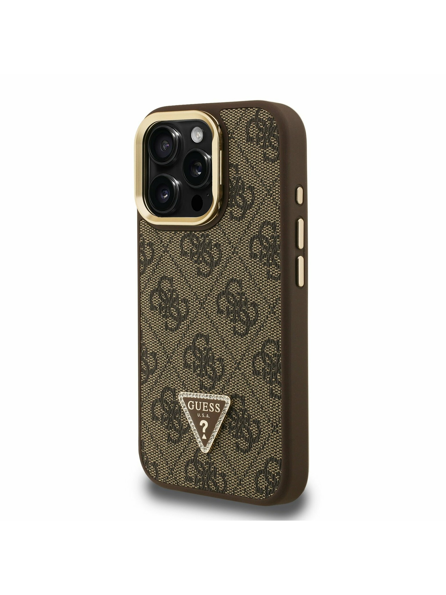 Guess PU 4G Strass Triunghi Logo Stand Carcasă Cameră MagSafe pentru iPhone 16 Pro Maro