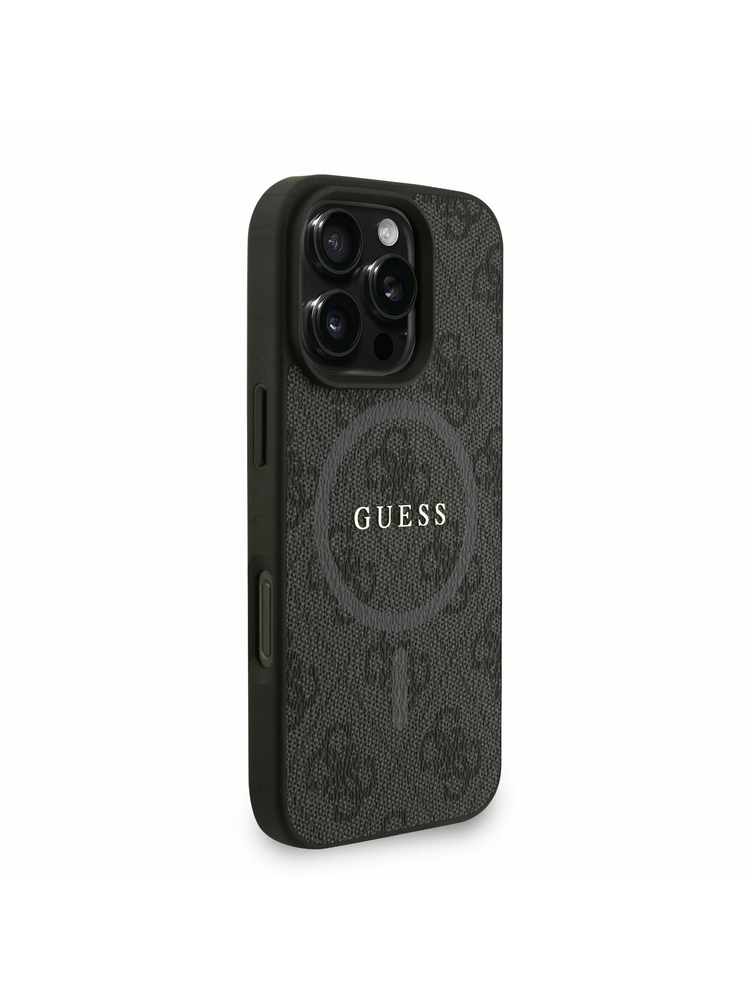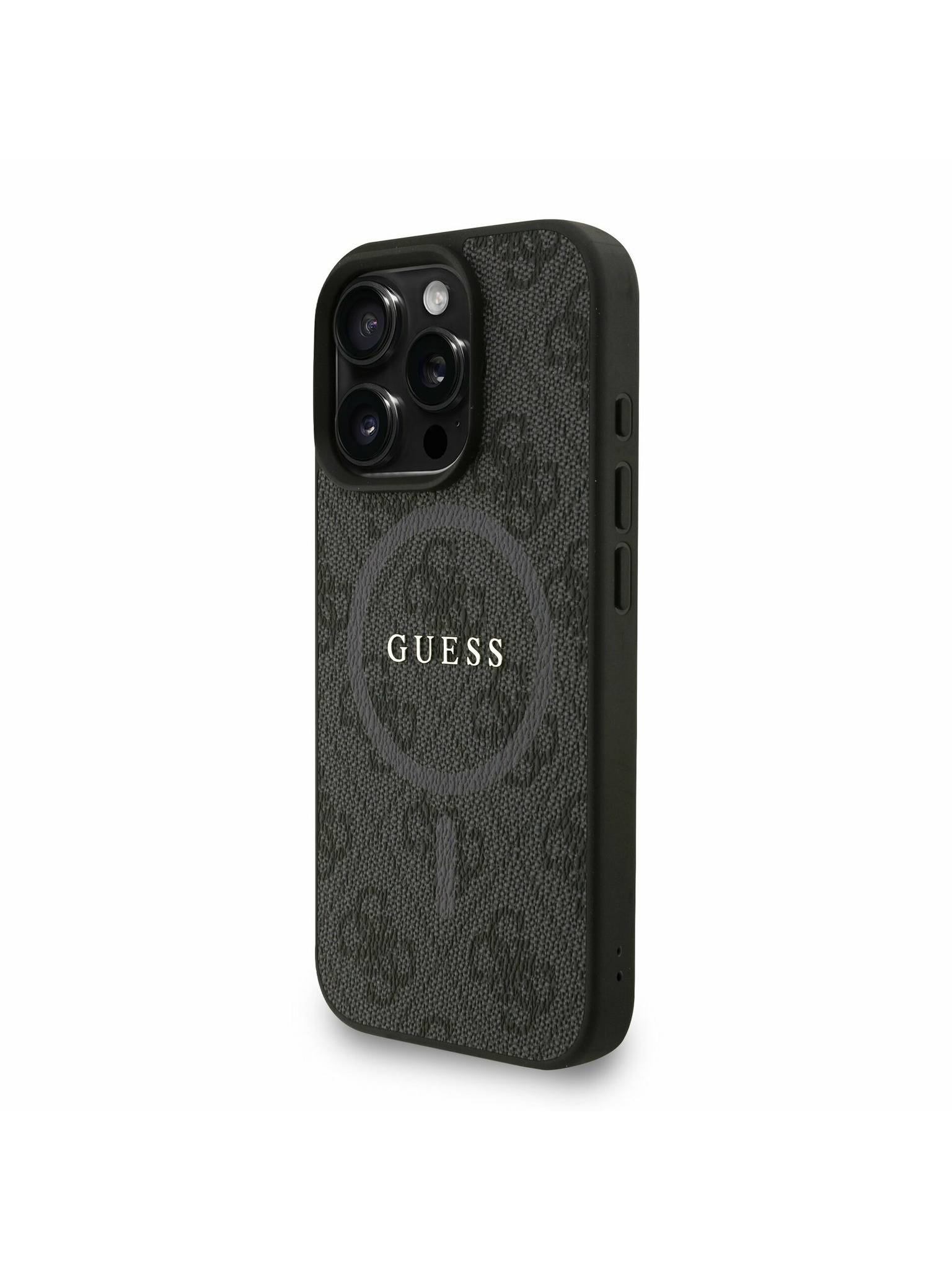 Guess PU Grained Trandafiri 4G Metal Logo Carcasă Spate pentru iPhone 16 Pro Negru